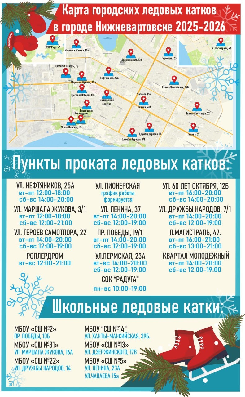 За работу 12 ледовых катков отвечают муниципальные спортивные учреждения. Особое внимание уделяется обустройству масштабной ледовой площадки на улице Пионерской (участок от улицы Нефтяников до центрального входа в парк Победы). Протяжённость катка составит 300 м.