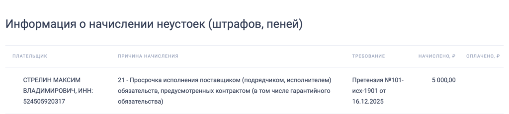 Срыв сроков, как выяснилось, обойдётся виновнику в целое состояние — по данным портала госзакупок, на подрядчика наложен штраф. Правда, его размер — 5 тысяч рублей — на фоне контракта в 11,5 миллионов смотрится скорее как символический выговор за опоздание.